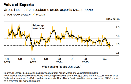 俄罗斯海运原油出口总收入(2022-2025年)