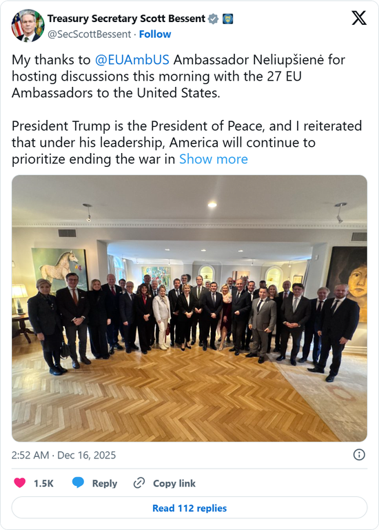 知情人士透露,美国财政部长斯科特·贝森特(Scott Bessent)本周早些时候会见一群欧洲大使时,就相关计划进行了磋商。他在会后通过社交媒体平台X发文称:“特朗普总统是和平总统,我重申,在他的领导下,美国将继续把结束乌克兰冲突列为优先事项。”